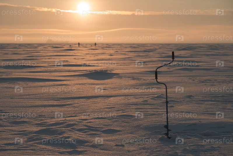 Ледовый рыболовный бур вкрученный в лед. Замершая поверхность моря. Тематика зимней рыбалки
