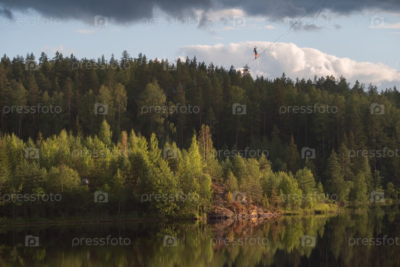 Канатоходец идет по хайлайну над озером в живописном красочном месте