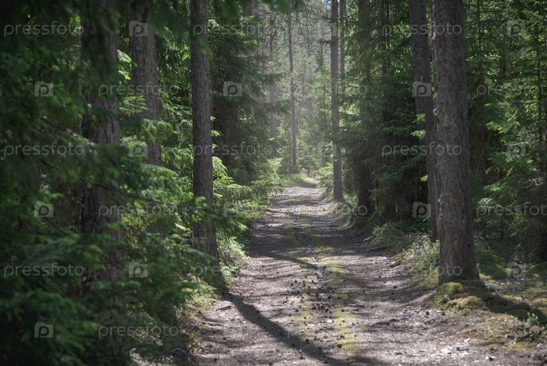 Дорога в хвойном лесу. Сосны и ели вдоль дороги