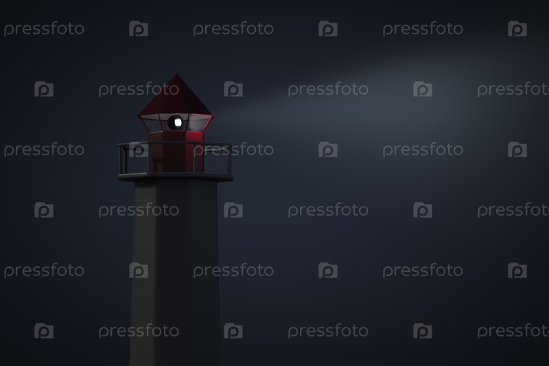 Морской маяк в туманную ночь. Светящийся прожектор в башне