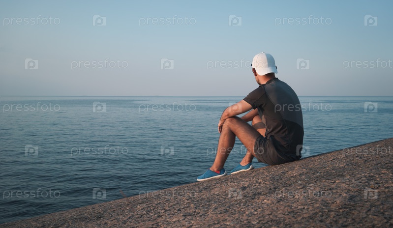 Молодой человек сидит на гранитном берегу моря и смотрит в даль