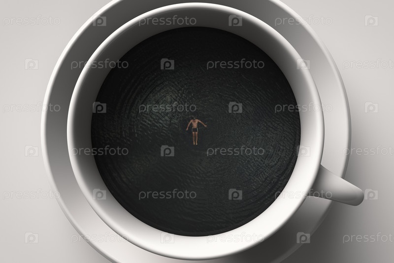 Мужчина плавает в бассейне стилизованном под кофейную кружку. Тематика горячих напитков
