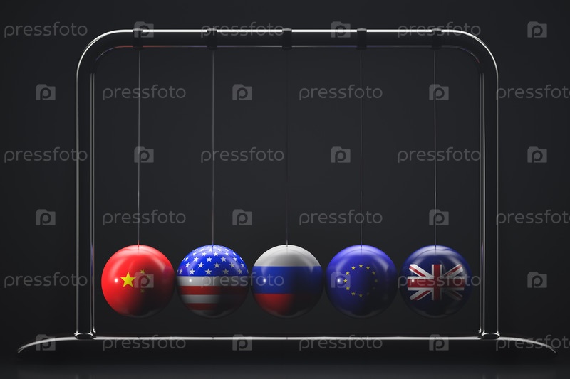 Маятник Ньютона. Шары с изображением государственных символов Китая, США, России, Евросоюза, Великобритании