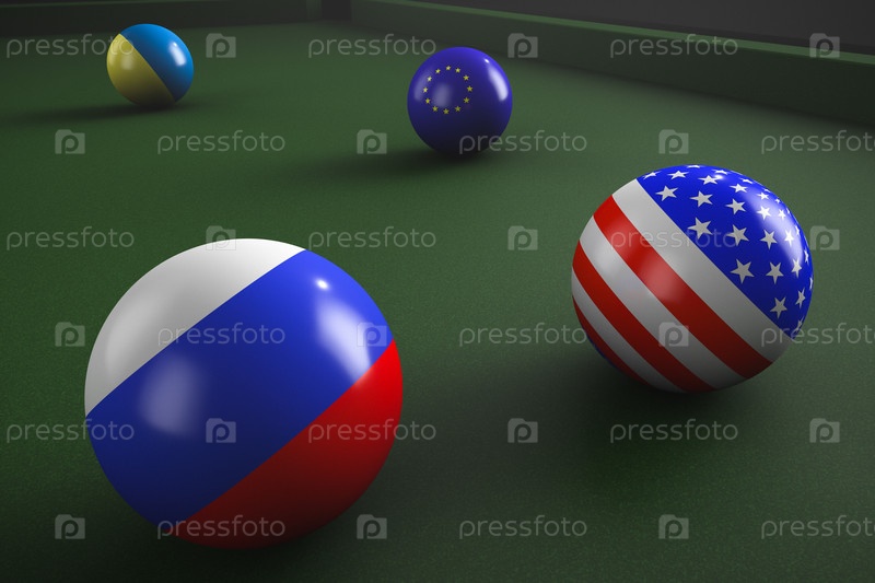 Бильярдные шары стилизованные в флаги России, США, Евросоюза и Украины. Геополитические игры