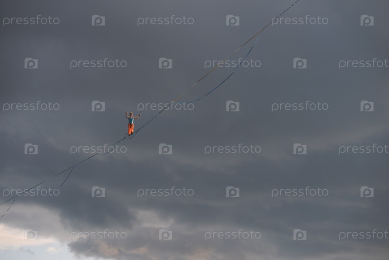 Хайлайн на фоне драматического неба. Канатоходец на большой высоте