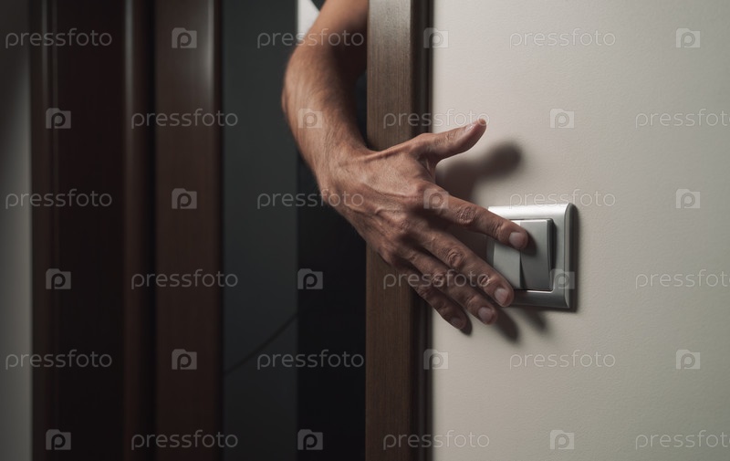 Рука тянется выключить свет. Тематика энергосбережения и экономии