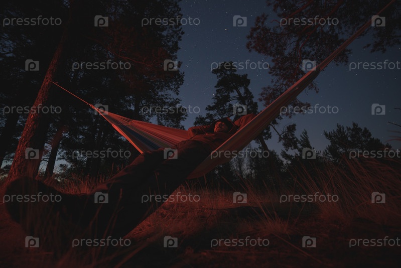 Мужчина спит в гамаке в живописном месте. Звездная ночь. Освещение костра