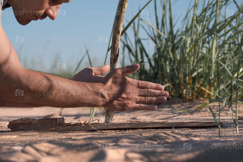 Мужчина пытается разжечь огонь без спичек и зажигалки. Выживание в диких условиях