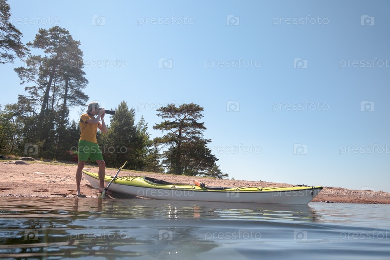 Фотограф-натуралист за работой на берегу в живописном месте. Рядом с ним каяк