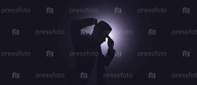 Силуэт мужчины в шляпе. Яркий свет на заднем плане