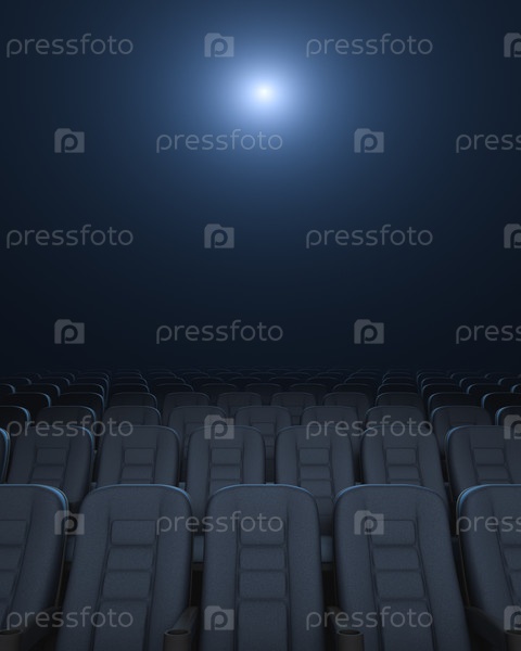 Пустой зрительный зал. Ряды кресел. Светящийся кинопроектор