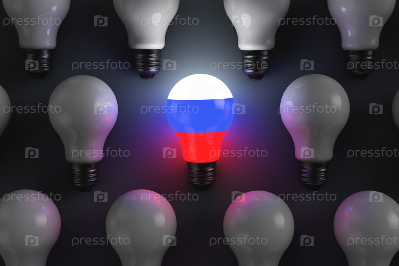 Светящаяся лампочка с русскими символами среди несветящихся лампочек
