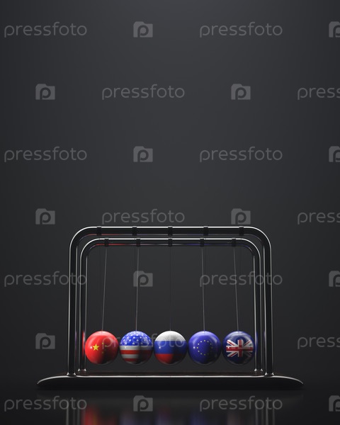 Колыбель Ньютона. Сферы с изображением государственных символов Китая, США, России, Евросоюза и Великобритании