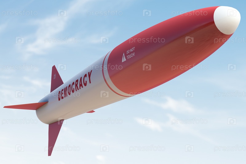 Летящая ракет с надписью Демократия. Геополитическая и военная тематика