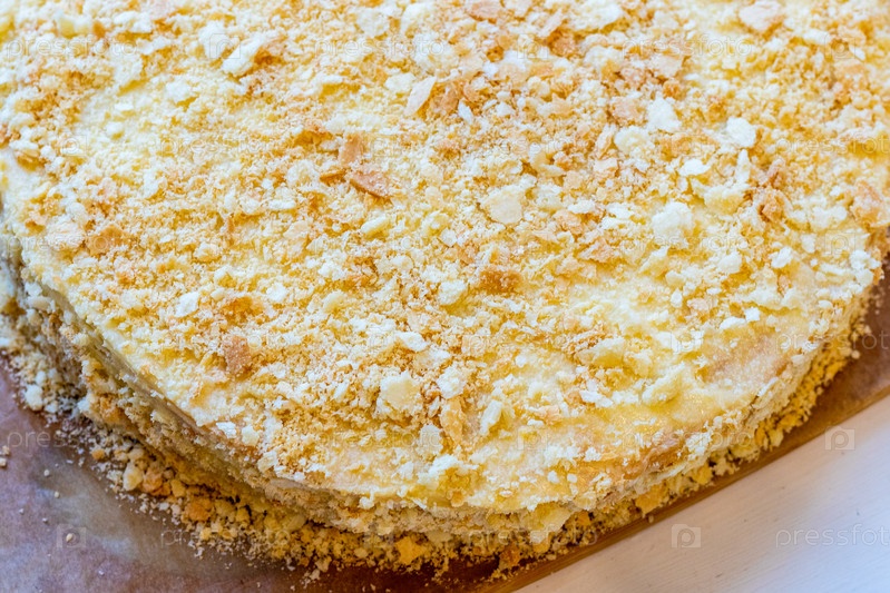 Слоеный круглый торт Наполеон с заварным кремом и посыпанный крошкой