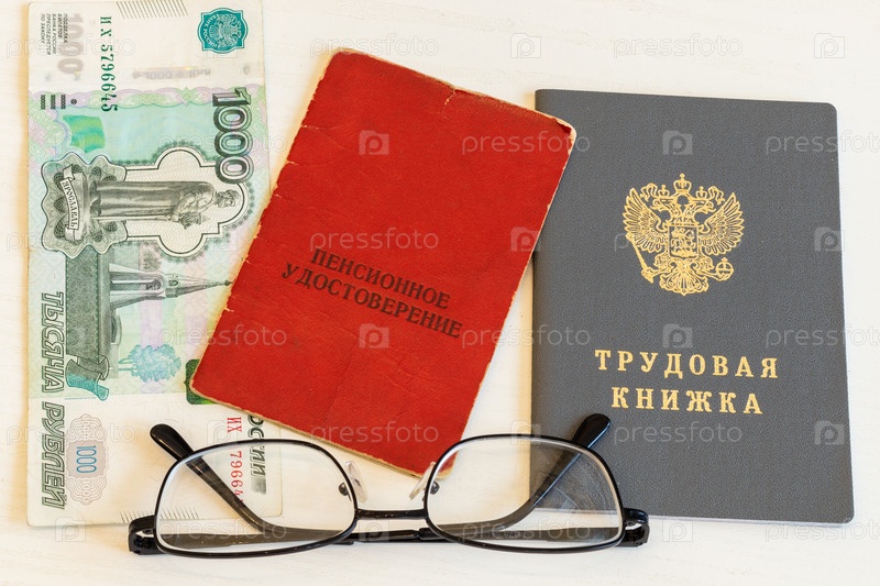 На столе трудовая книжка работника, пенсионное удостоверение, очки и деньги. Надписи в удостоверении: «Трудовая книжка», «Пенсионное удостоверение»