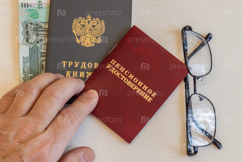 На столе трудовая книжка работника, пенсионное удостоверение, очки и деньги. Надписи в удостоверении: «Трудовая книжка», «Пенсионное удостоверение»