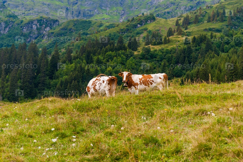 Коровы пасутся на зеленом лугу швейцарских Альп