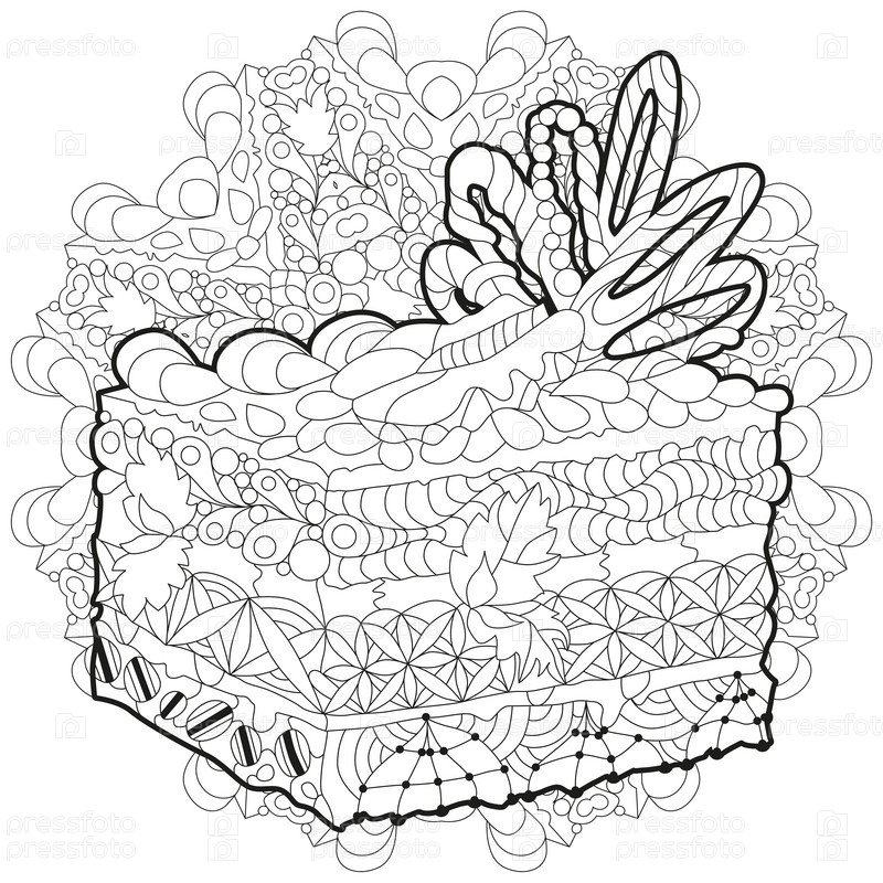 Векторный кусок пирога с абстрактными орнаментами мандалы.Ручная иллюстрация для окраски, для футболки в стиле зентагле, в стиле каракулей