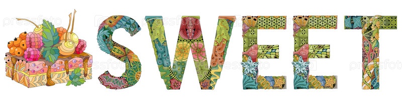 Художественный дизайн ручной росписи. Ручной рисунок слова СЛАДКИЙ с кусочком торта для футболки и других украшений