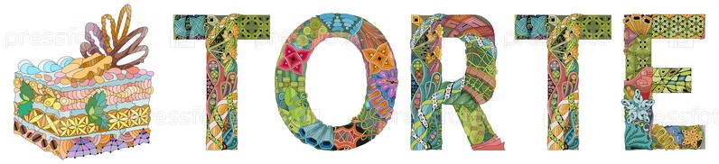 Художественный дизайн ручной росписи.Ручное изображение слов TORTE с куском торта для футболок и других украшений