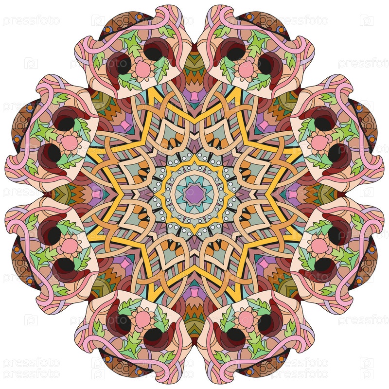 Декоративные круглые украшения. Необычная форма цветка. Восточный вектор, схемы антистрессовой терапии. Переплетение элементов дизайна. Вектор логотипов йоги