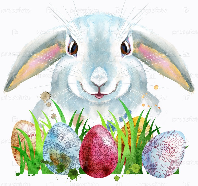 Милый белый кролик на белом фоне с яйцами и травой, изолированные