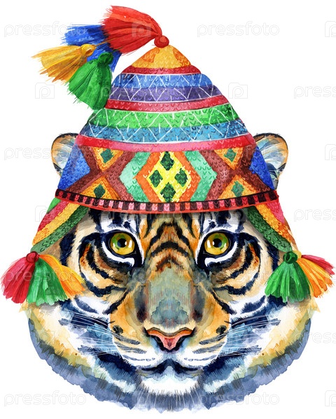 Тигр в шапке чулло. акварельная иллюстрация с брызгами на белом фоне