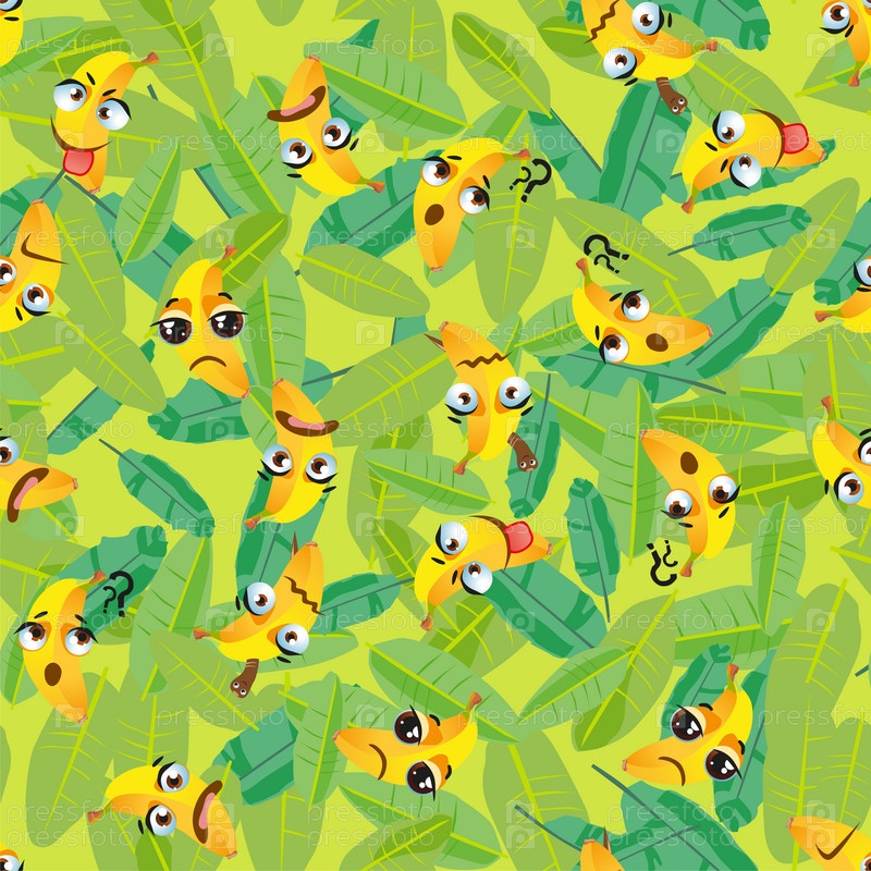 Бесшовный узор из экзотических фруктов банан. Смешные милые лица персонажей