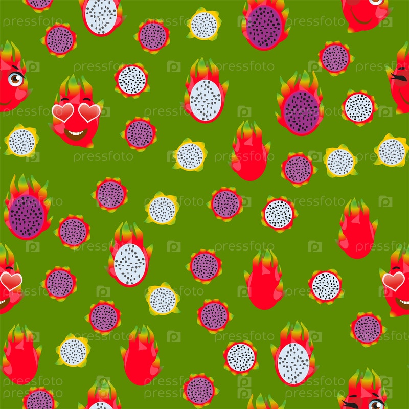 Бесшовный узор из экзотических фруктов питайи. Смешные милые лица персонажей