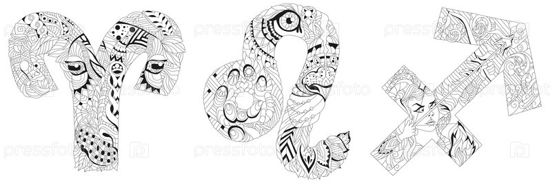Ручная роспись художественного дизайна для окраски. Ручной рисунок слов Овен, Лев и Стрелец для футболки и других украшений