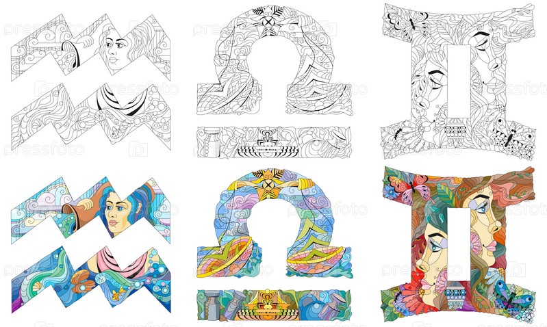 Воздушные знаки зодиака Весы, Близнецы, Водолей. Векторный объект зэнтгел для окраски. Набор цветов и контуров