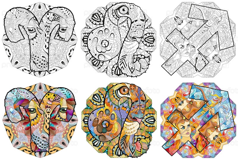 Стихия Огня – это знаки зодиака Овен, Лев и Стрелец с мандалами для раскрашивания. Набор цветов и контуров