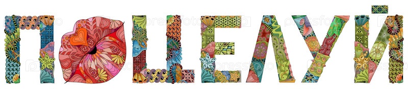 Слово KISS на русском языке с силуэтом губ. векторный декоративный объект zentangle