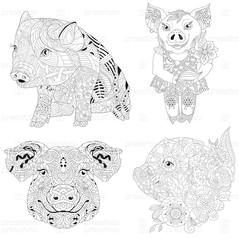 Иллюстрация Zentangle с свиньями. Зентенгл или каракули - поросенки. Домашнее животное для окраски