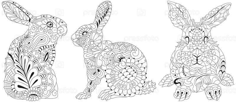 Набор кроликов. Пасхальный фон с творческим милым кроликом. Красочная векторная иллюстрация. Символ 2023 года для раскраски