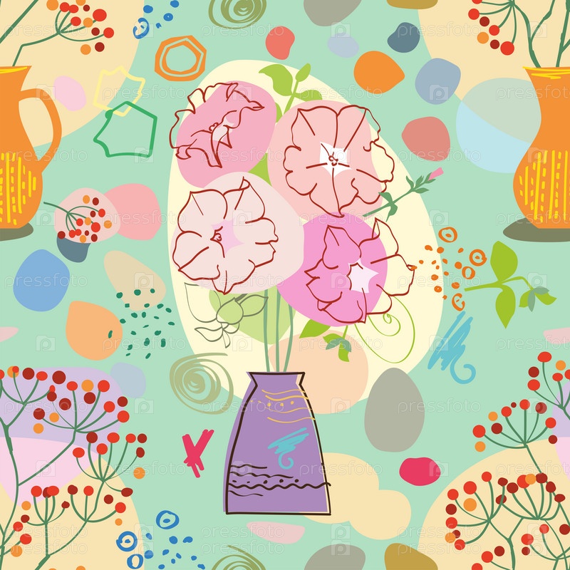 Бесшовные абстрактные плакаты с вазами. Модный коллаж натюрморта с горшком, фруктами, вазой и тропическим пальмовым листом