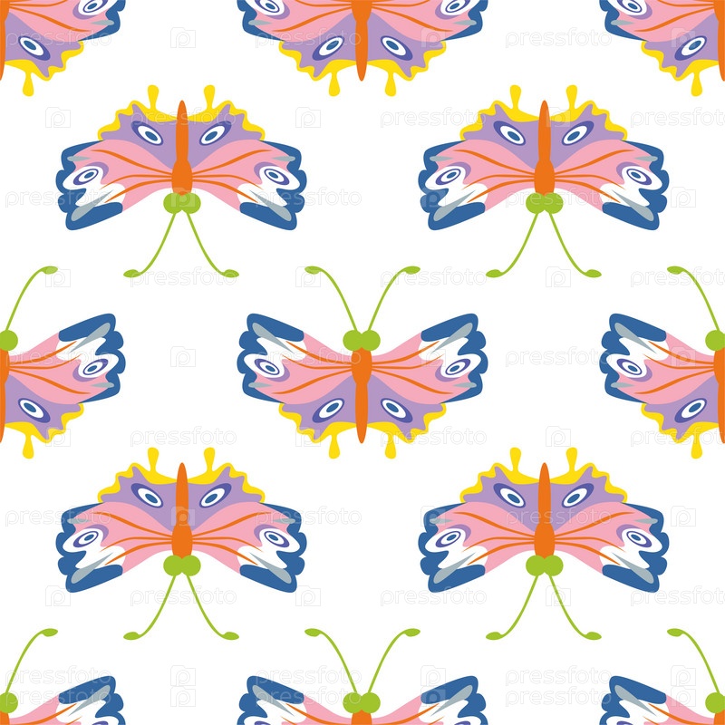 Бесшовный узор с бабочкой на белом фоне. Векторная иллюстрация. Печать на ткани, бумаге, обоях, дизайн упаковки