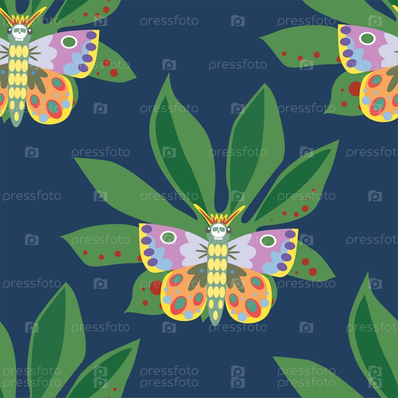 Бабочка бесшовный модный узор на синем фоне. Векторная иллюстрация