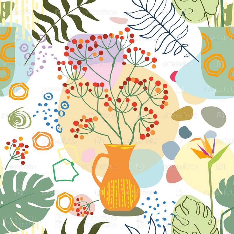 Безшовная абстракция с вазами. Модный коллаж натюрморта с горшком, растением и вазой. Ручной рисунок минималистского набора векторов формы. Иллюстрационный горшок с цветочным изображением для декоративного интерьера