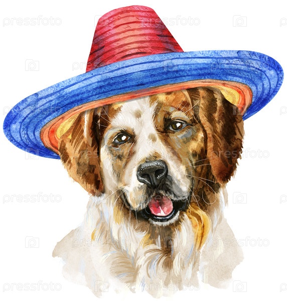 Симпатичная собака в сомбреро. Графика на футболках с собаками. Акварель трехцветная иллюстрация собаки