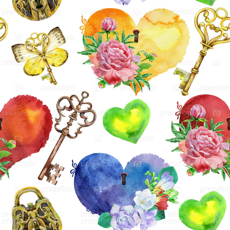 Бесшовный акварельный узор со старинными сердцами, ключами и пионами на белом фоне