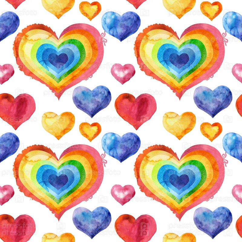 Бесшовный рисунок акварельных радужных сердец со светом и тенью, нарисованный вручную