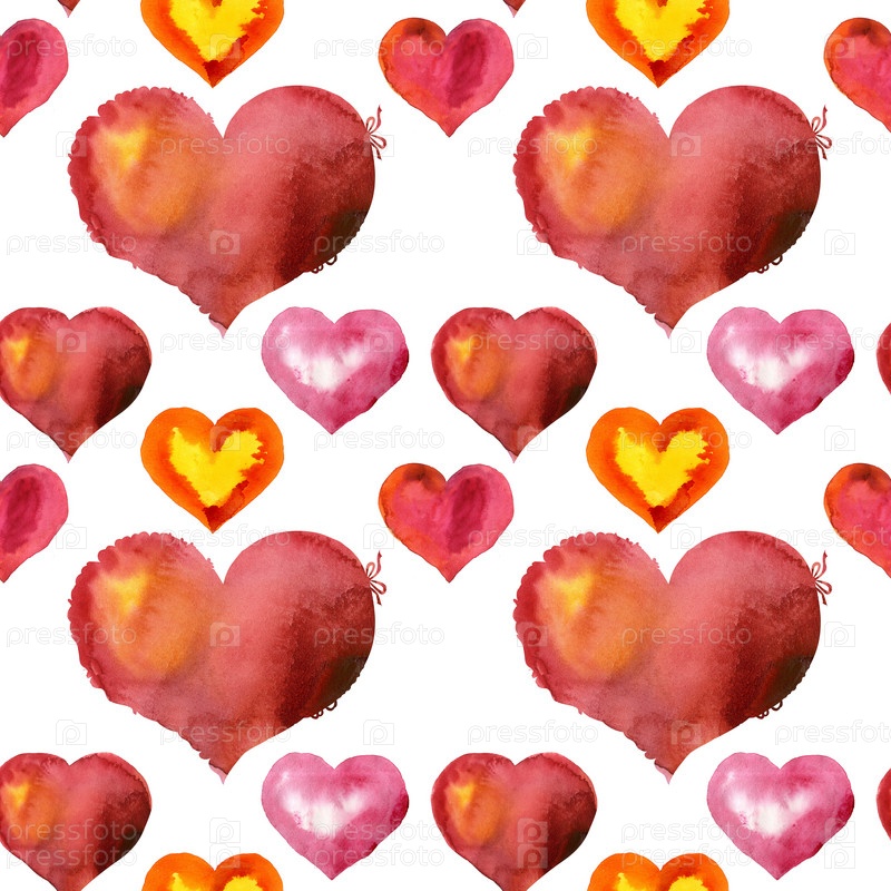 Бесшовный рисунок акварельных красных сердец со светом и тенью, раскрашенный вручную