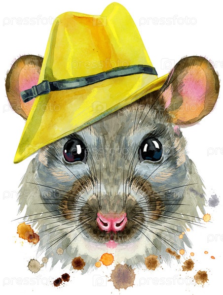 Симпатичная крыса в желтой шляпе для графики на футболках. Акварельная иллюстрация крысы