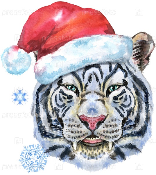 Акварельная иллюстрация белого тигра в шляпе Санты