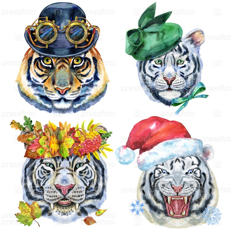 Акварельная иллюстрация тигров в шляпе Санты, в осеннем венке, зеленой шляпе и котелке с гуглами