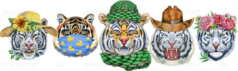 Граница тигра с различными аксессуарами. Акварельная иллюстрация диких животных на белом фоне