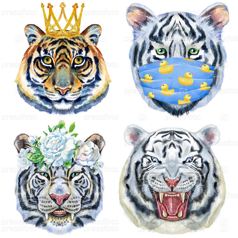 Набор портретов тигра. Акварельная иллюстрация диких животных на белом фоне