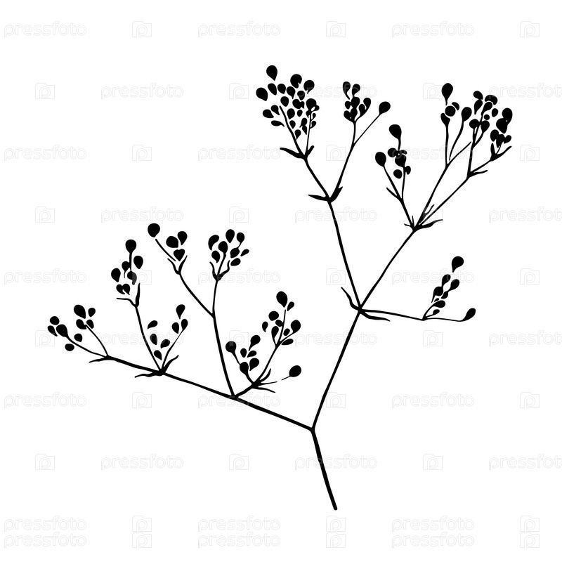 Цветочная ветка. чернильный набросок. ботанический рисунок. нарисованное вручную дикое растение с маленькими цветами. силуэт кисти тушь. Черный изолированный вектор на белом фоне. Графическая иллюстрация